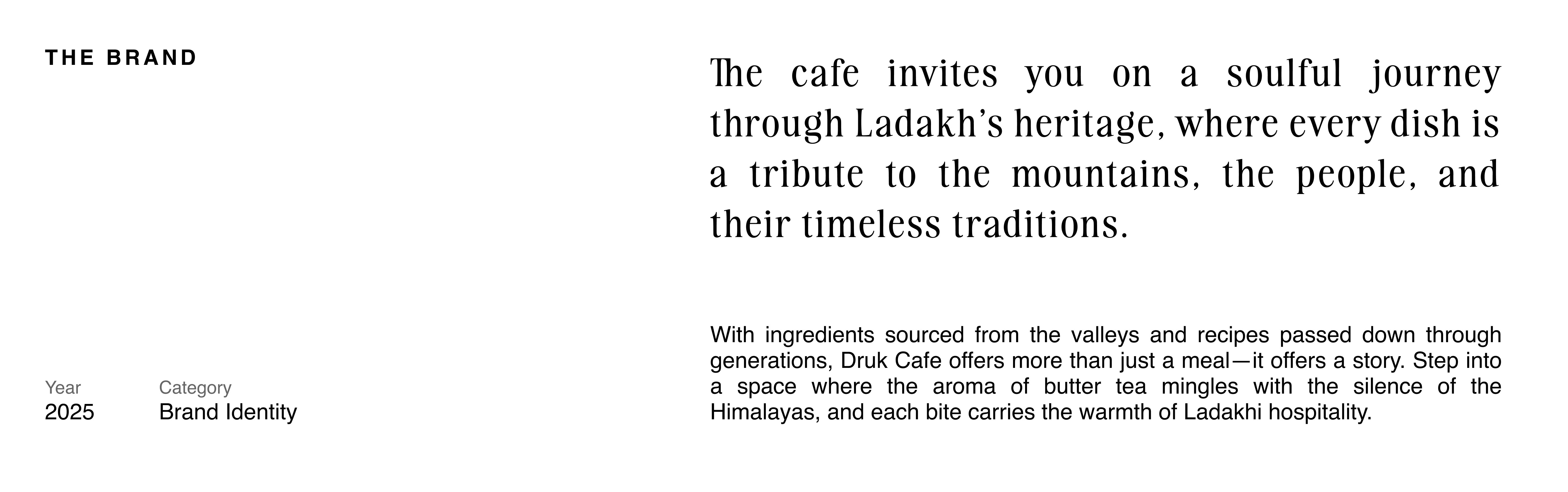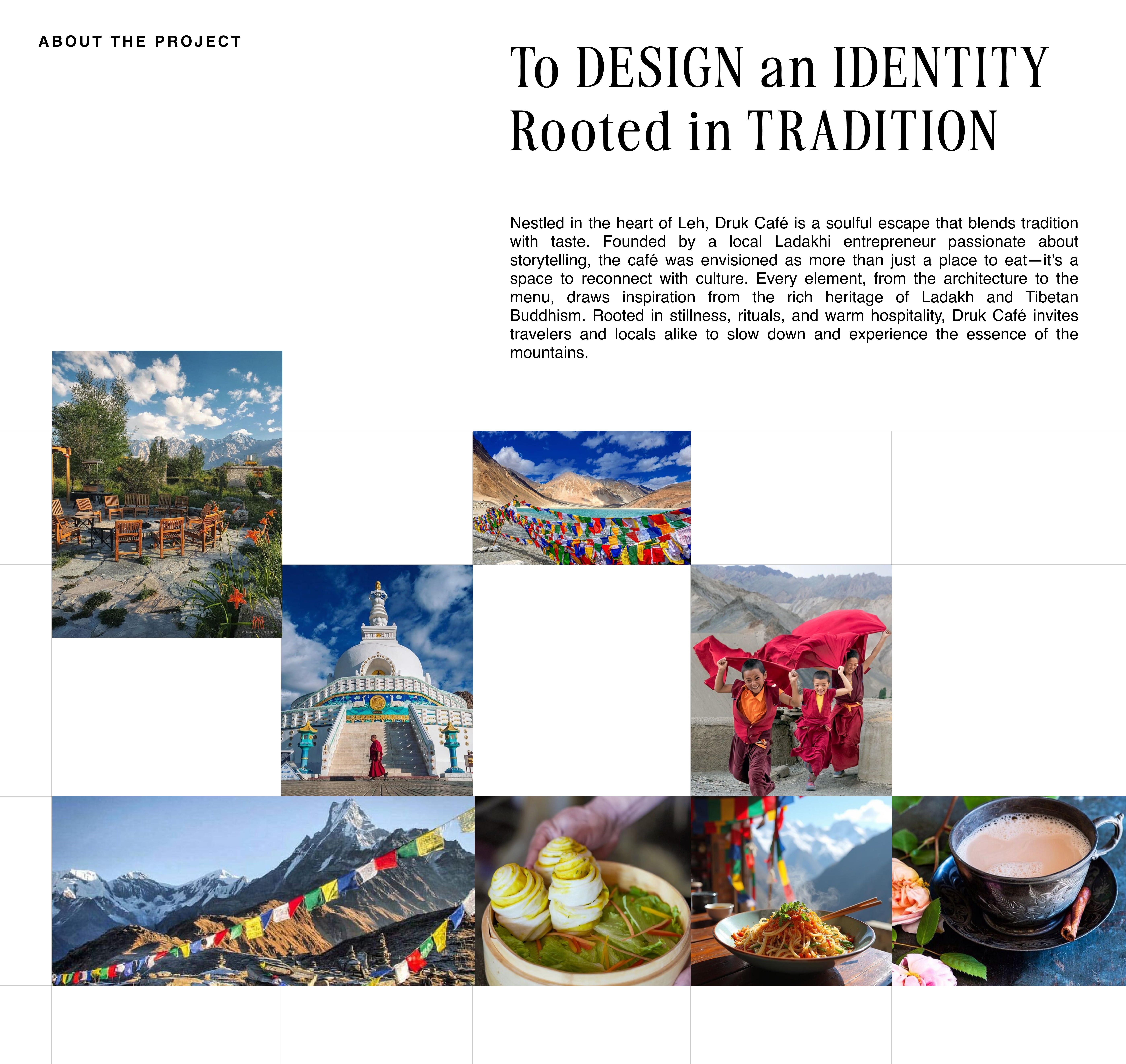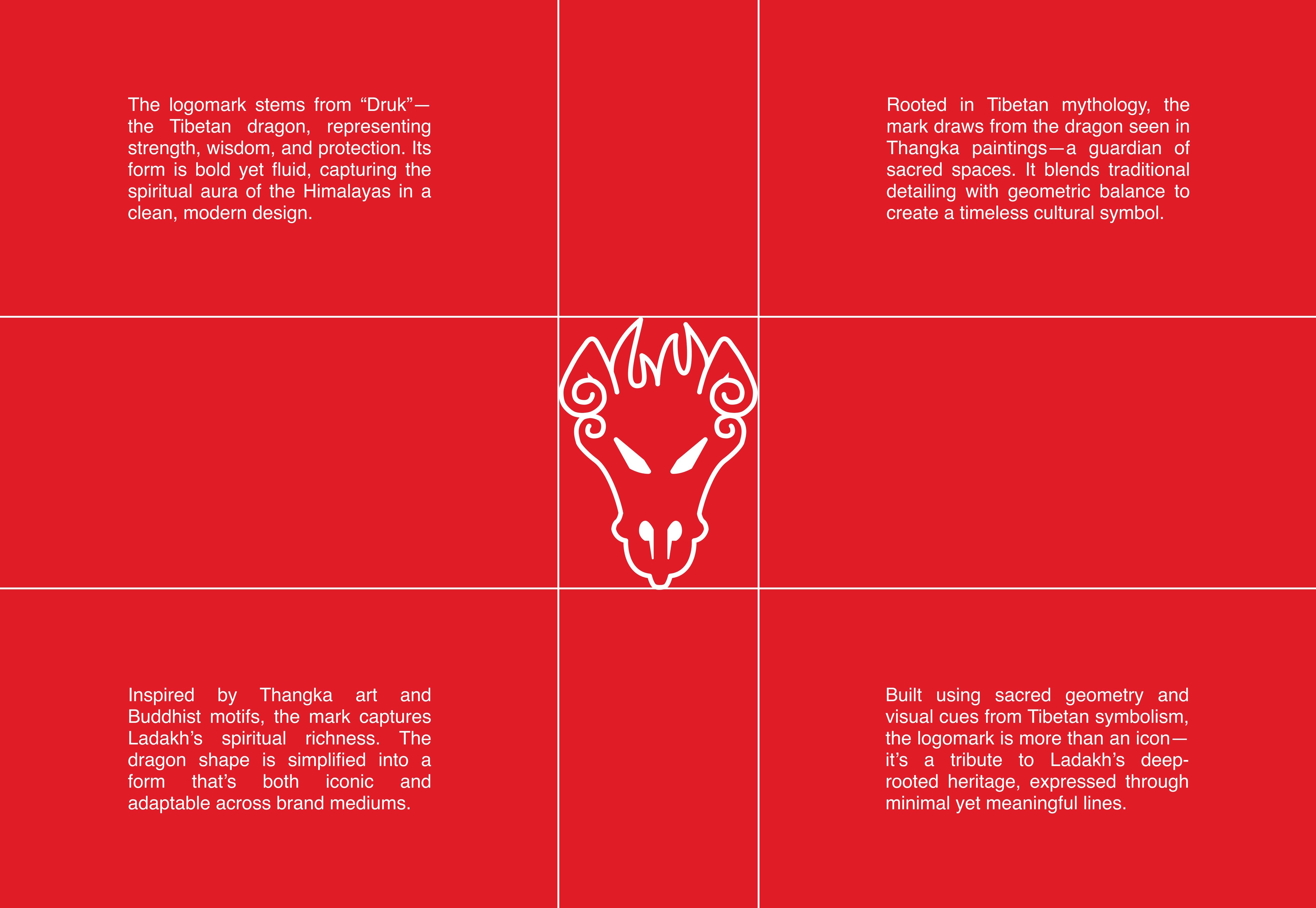Druk Cafe is a soulful café nestled in the heart of Ladakh, celebrating the region’s rich culture, heritage, and warmth. The branding captures the essence of the Himalayas through a harmonious blend of traditional symbolism, Tibetan-inspired typography, and a clean modern aesthetic. Every element—from the dragon-inspired logomark to the Ladakhi wordmark—was crafted to reflect the cafe’s identity as a cultural retreat rooted in storytelling, community, and mindfulness.